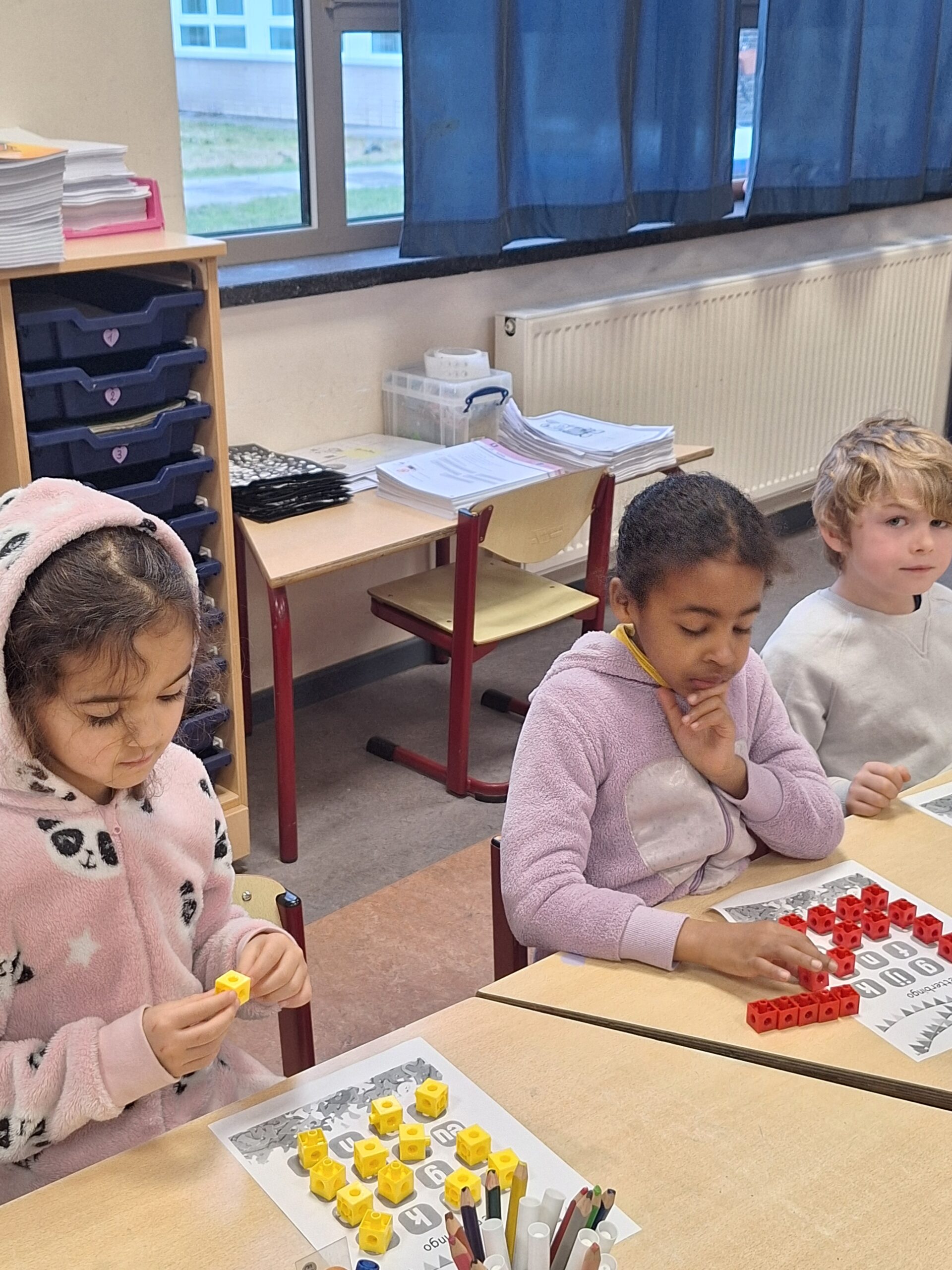De voorbije maanden kregen we heel wat meer inzicht in de getallen en getalfamilies tot 10. Sinds kort zijn we dan ook gestart met de getallen tot 20. Om hier meer inzicht in te krijgen maken we gebruik van allerhande materialen. We zijn ervan overtuigd dat hoe meer de kinderen handelen, hoe beter ze dit zullen begrijpen en kunnen toepassen.