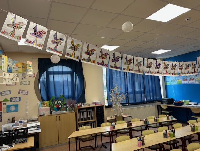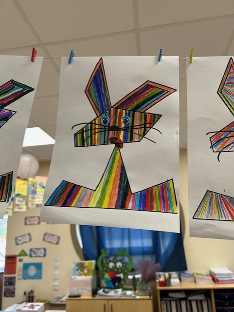 Onze knutselwerkjes van vorige week werden ook verder afgewerkt en zijn te bewonderen in onze klas. Kleurrijk zijn ze wel!