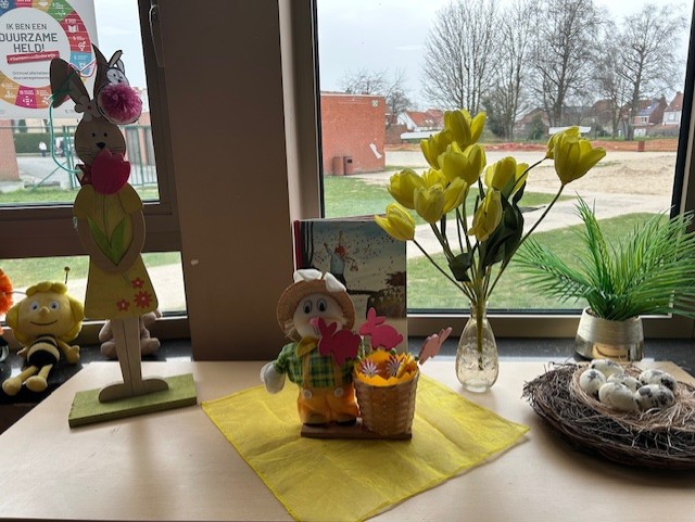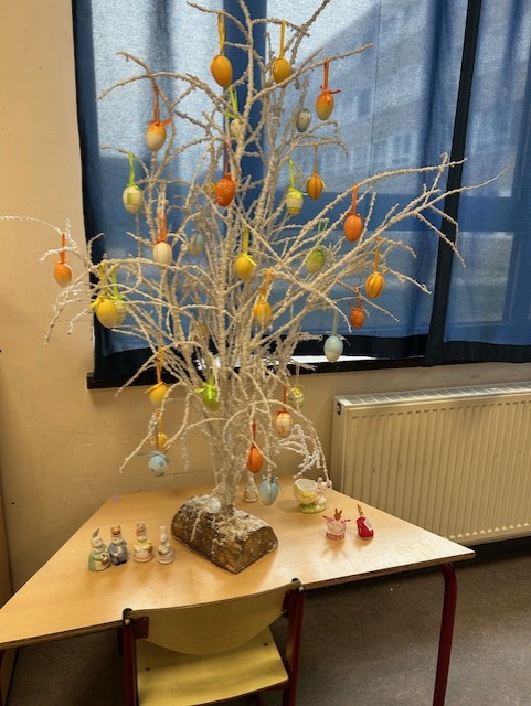 Onze klas is al helemaal omgetoverd in een leuke en gezellige paassfeer, met dank aan de grootmoeder van Ella-Noor die ons een prachtige paasboom gaf.