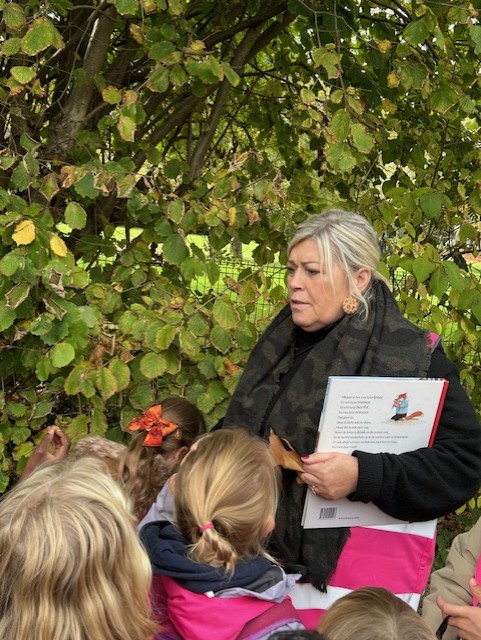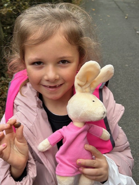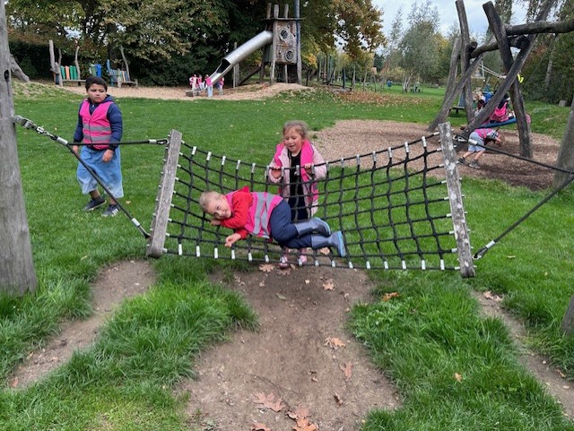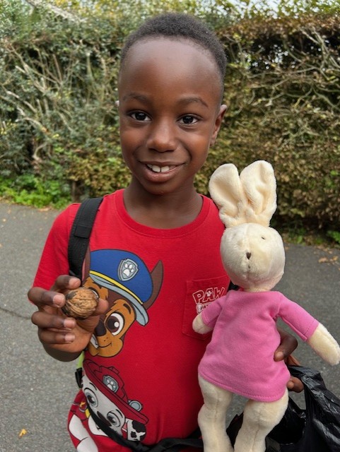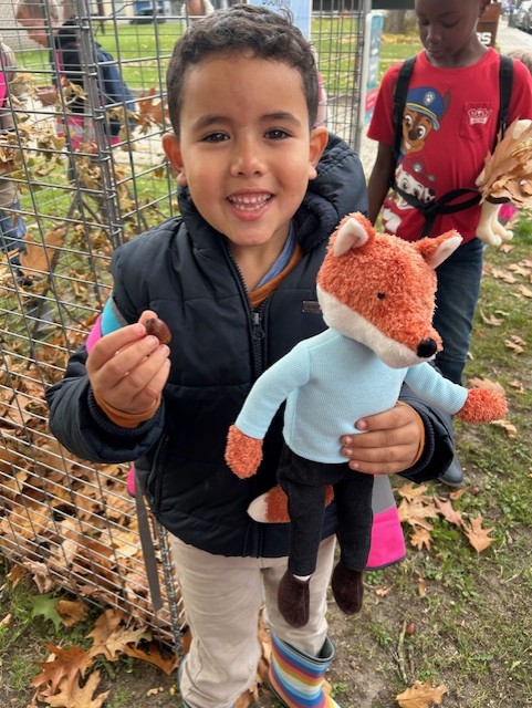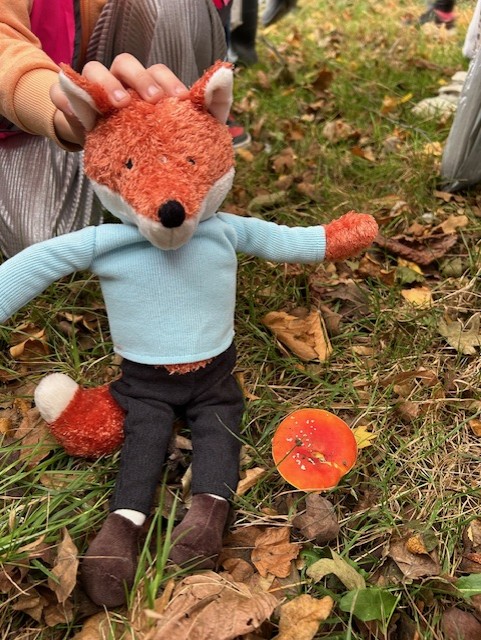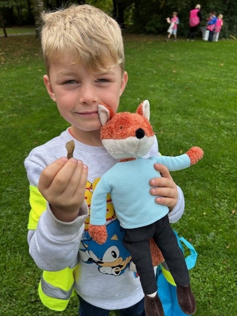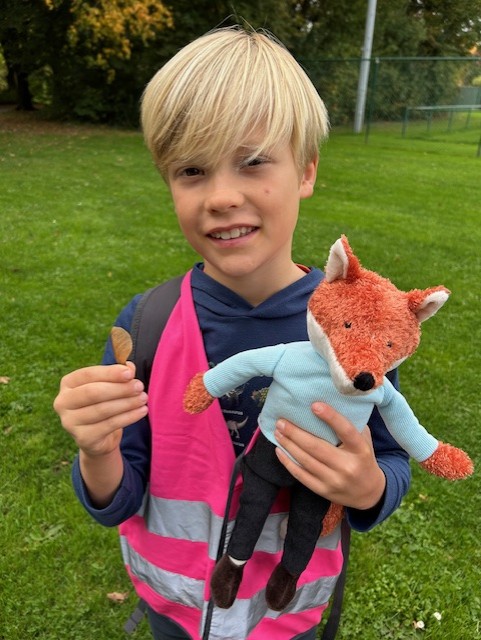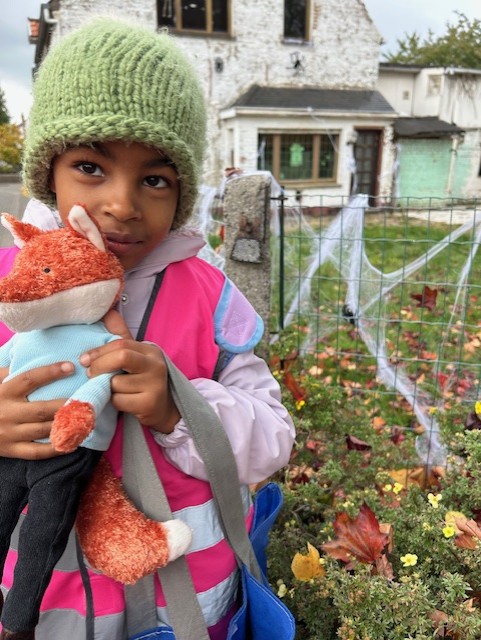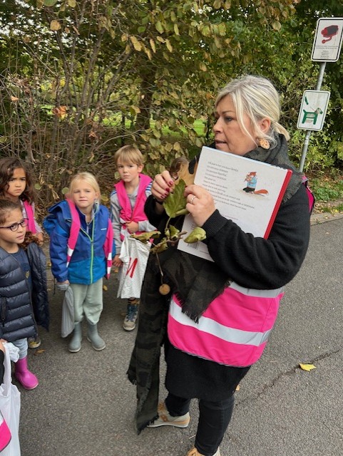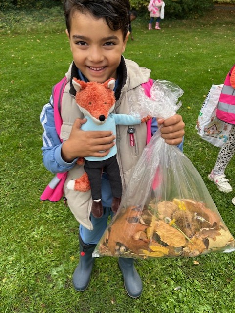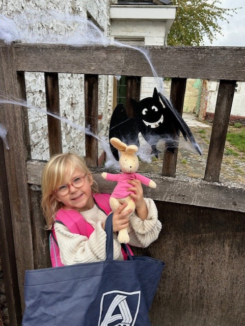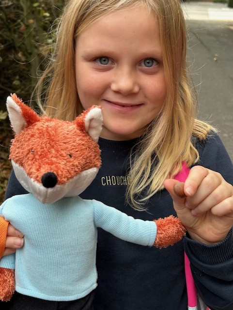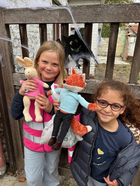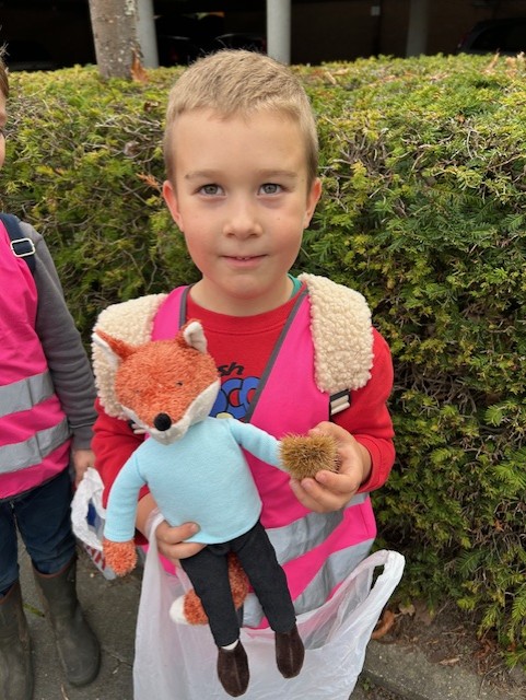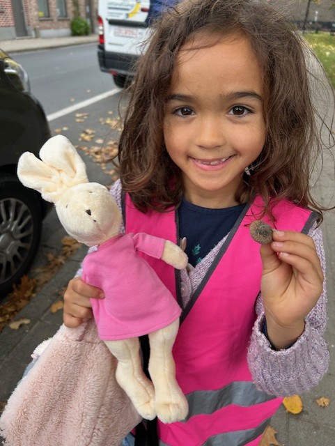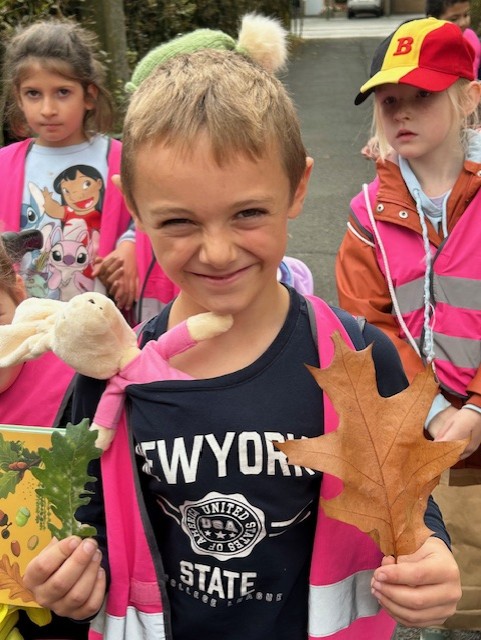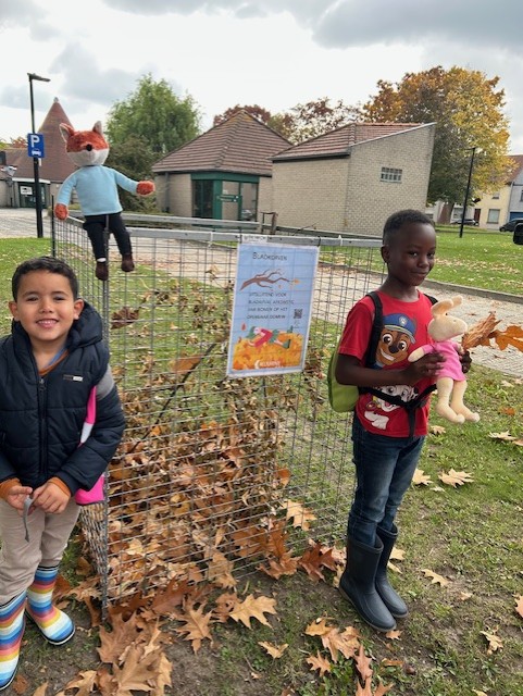 Dinsdagnamiddag gingen we samen met het eerste en tweede leerjaar op herfstwandeling richting het sportpark. Haas en vos gingen uiteraard mee op wandeling! Samen met hen observeerden we de natuur in volle herfst. We zagen al heel wat verkleurde en afgevallen blaadjes. We stopten op allerlei plekjes en natuurlijk moest vos of haas hierbij telkens op de foto. Zo zagen we aan de bibliotheek een grote bladkorf staan waarin alle afgevallen blaadjes kunnen worden verzameld, we ontdekten het verschil tussen een winter- en zomereik, namen het verschil waar tussen een tamme en wilde kastanje, we leerden bij over de esdoorn en nu weten we ook dat het esdoornblad op de vlag van Canada staat, enz. Nadien kregen we nog even de tijd om ons koekje/fruit op te eten en eventjes te spelen in het sportpark of verder op zoek te gaan naar herfstelementen.